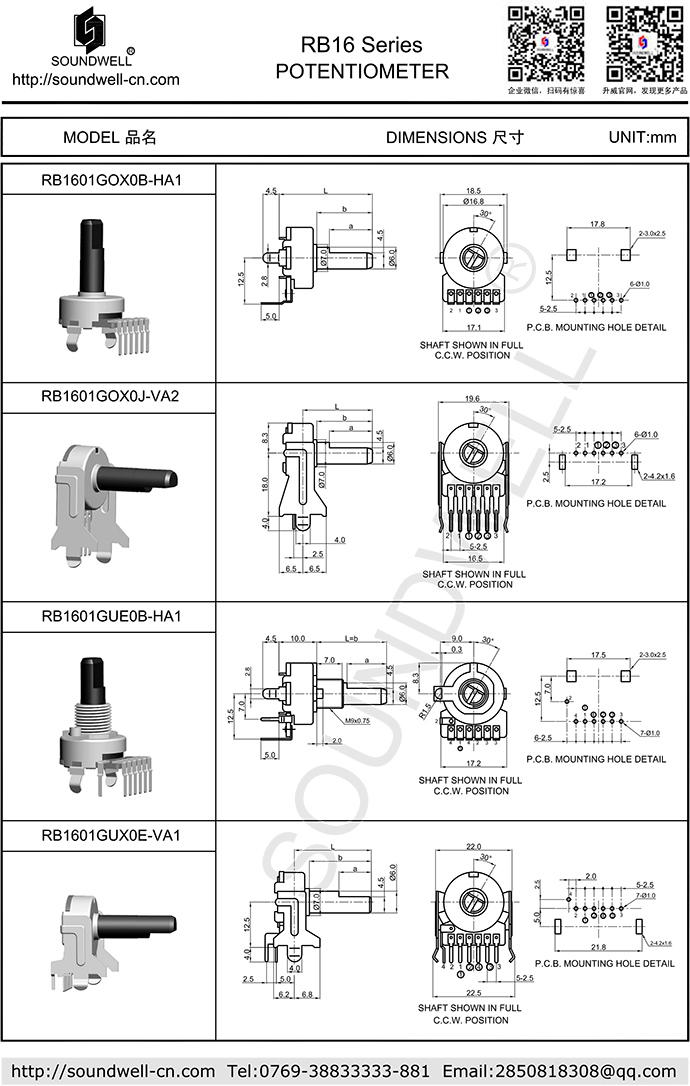 | Main Specifications: | Total resistance error: ±20% Total rotational angle: 300±10° Rated power: 0.2W Operating temperature: -10°C~60°C Rotational life: 10,000 cycles Min |