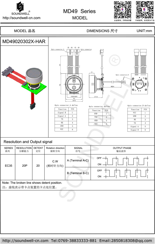 Rated voltage: DC 3.6V; Maximum rated current: 150mA; Working temperature: -20℃~80℃; Mechanical rotational angle: 360°; Number of detent: 20; Pulses: 20; Rotational life: 30,000 cycles Min; |
