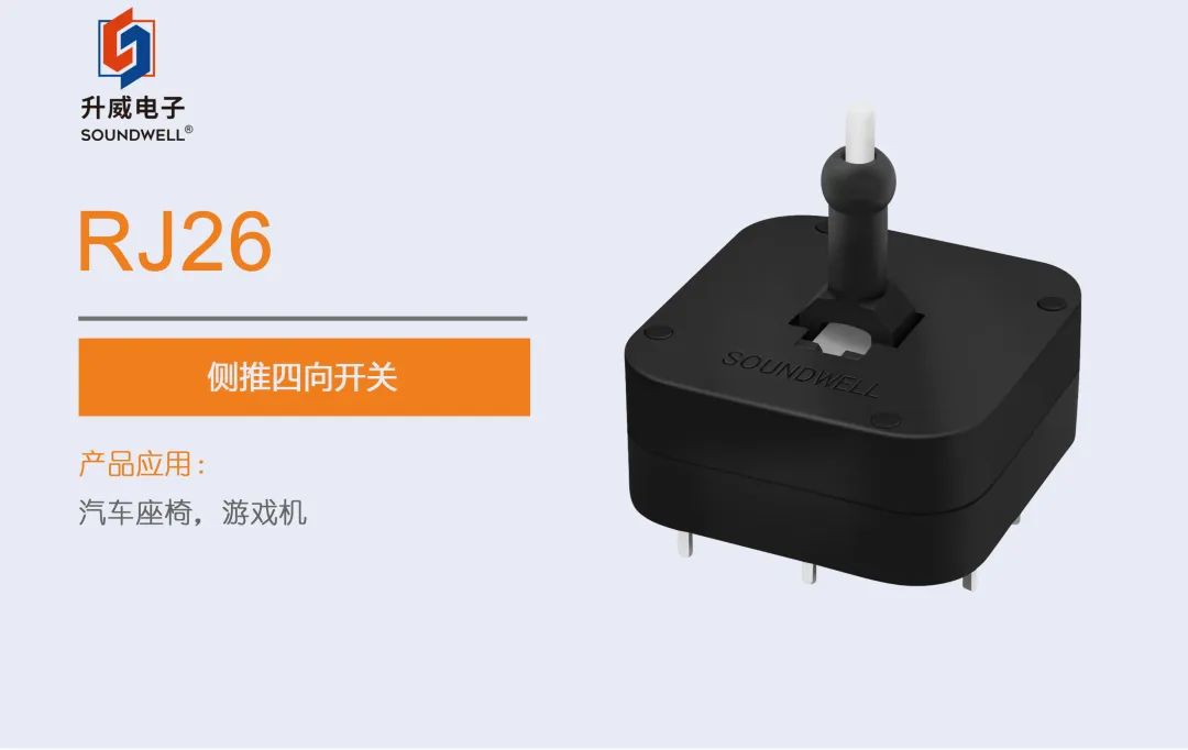 除此以外,應(yīng)用在汽車座椅調(diào)節(jié)的開關(guān)我們還有RJ26,它與RJ20最大的區(qū)別是一款側(cè)推四向開關(guān)(中間無按壓功能),可進行四個方向的調(diào)節(jié)。