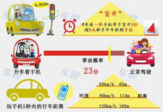數(shù)據(jù)顯示,開車時看一眼手機至少需要3秒,換句話說,也就是看一眼手機等于盲開3秒,假如車輛以60千米的時速行駛,前方遇到緊急情況需要剎車時,剎車距離至少是20米,如果邊開車邊看手機,一旦遇到緊急情況,剎車距離會變大,后果將不堪設想。